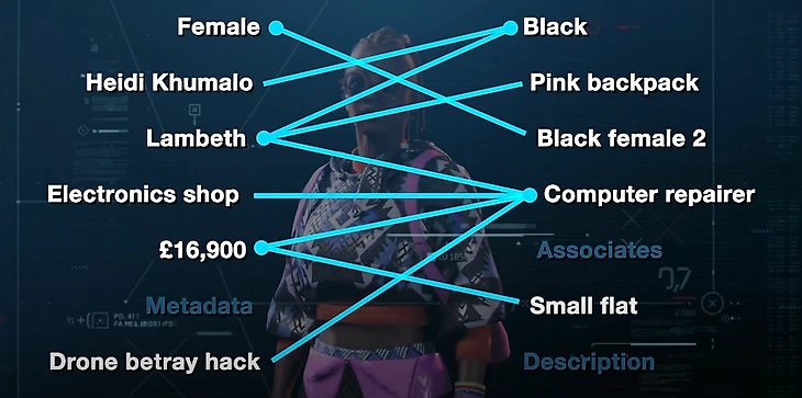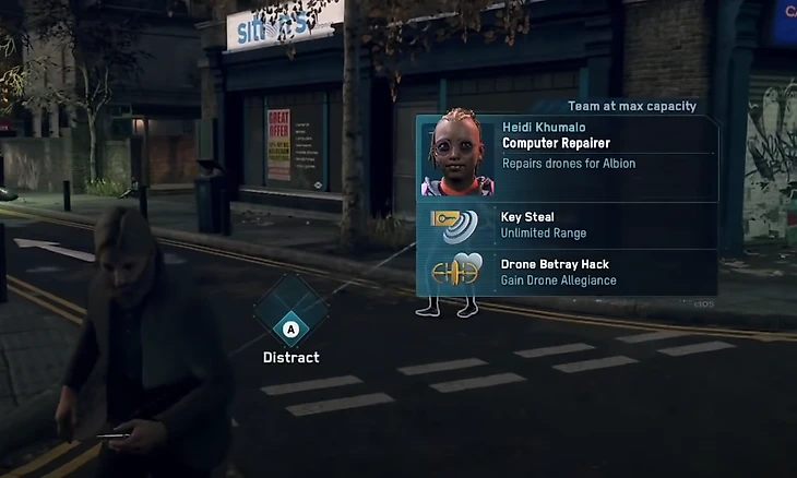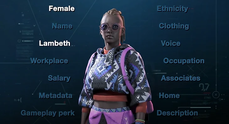 Хейди живет в боро Ламбет – это влияет на возможность получения особой этнической принадлежности, одежды и работы. Ее происхождение и гендер влияют на имя и голос. Ее профессия влияет на место работы, зарплату и геймплейные перки – она может взломать дрон, потому что работает в мастерской по ремонту дронов. Зарплата влияет на ее место проживания – небольшую квартиру. Эти пункты и немного рандома позволяют игре построить полноценное дневное расписание Хейди: она спит дома, навещает бабушку в больнице, работает в магазине электроники и иногда занимается вандализмом.
