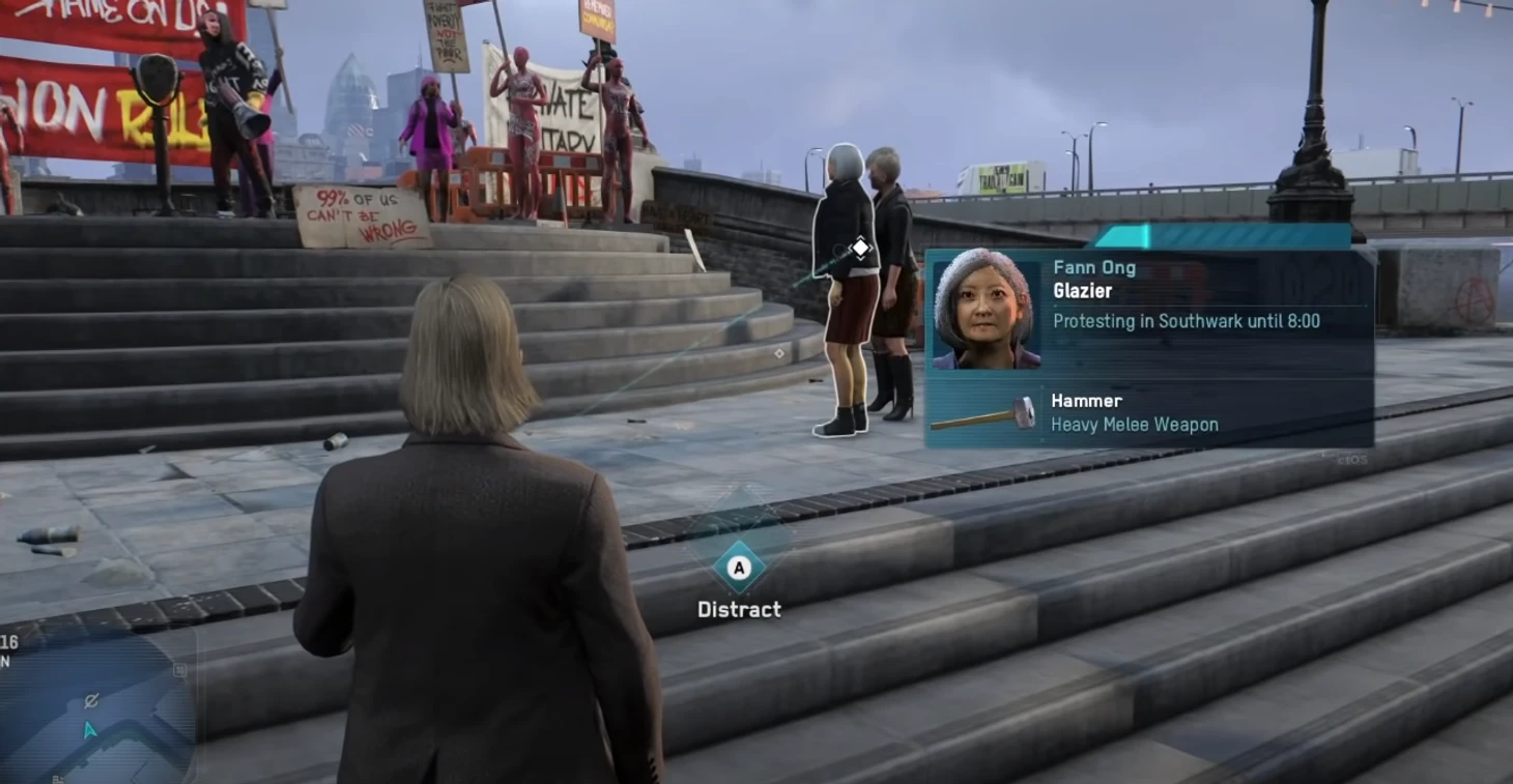 Пожилая дама целыми днями будет протестовать, повторяя несколько однотипных анимаций. Она может заниматься этим всю ночь. Но если вы просканируете ее, то она получит полную предысторию – включая протест, который теперь станет частью ее расписания. Леди выйдет на митинг на час, а потом отправится на работу в антикварный магазин, почитает детективный роман в Саут-Бэнке и ляжет спать дома в Уолворте.