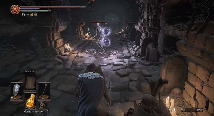 Катакомбы Картуса – многоуровневая локация, в которую мы попадаем сразу после убийства Хранителей Бездны. Здесь куча скелетов: слабые мечники, стрелки, маги, быстрые скелеты-убийцы со светящимися глазами, а под конец на нас и вовсе скатывают костяной шар, который сносит огромное количество HP. Если драка с костлявыми вас не интересует, то в катакомбах есть самый простой шорткат в серии: сразу после перехода в локацию держитесь правой стороны и падайте с одной платформы на другую.