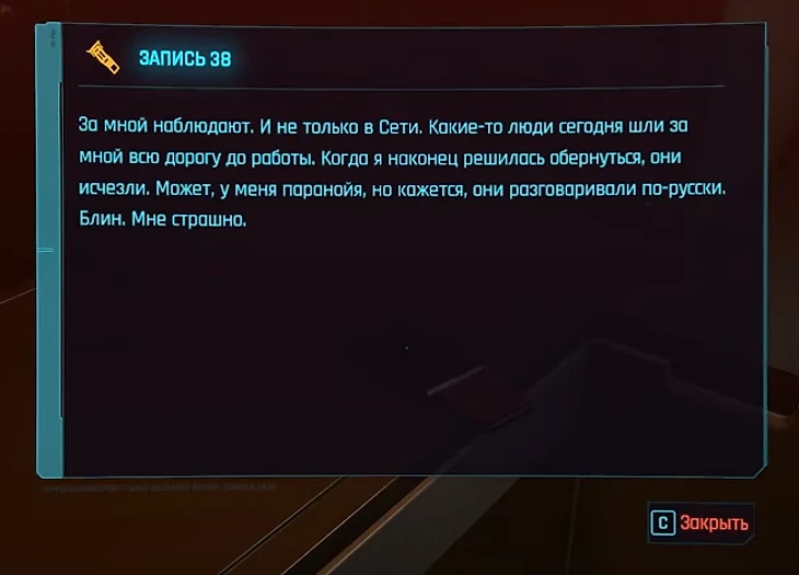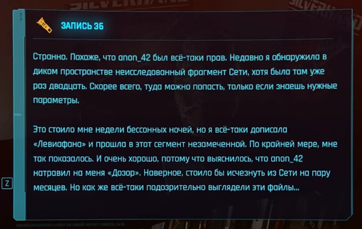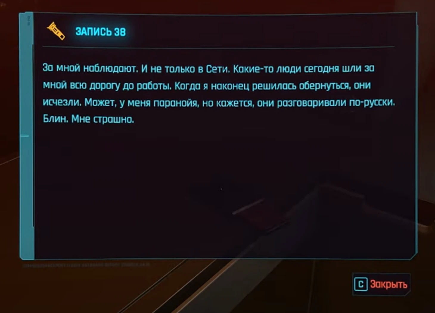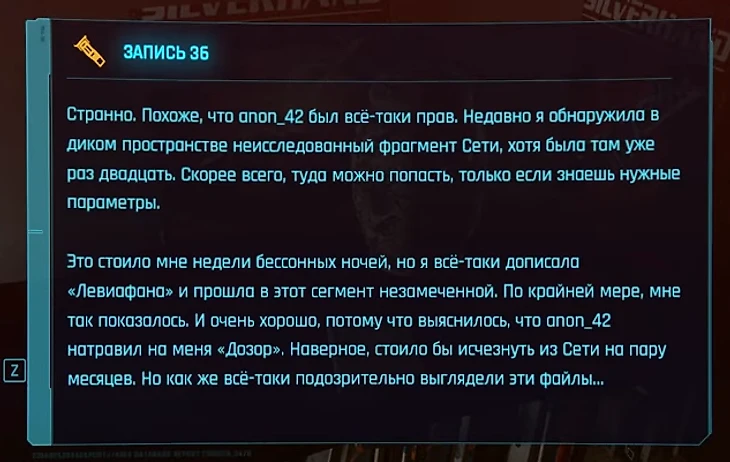 Сандра не разозлится, если вы взломаете чип. С ней можно поговорить о том, что страшно жить в мире, где корпорации манипулируют сознанием людей. А еще у нее дома можно обнаружить записки – она рассказывает, как взломала неисследованный фрагмент Сети и узнала о проекте по изменению сознания людей. Девушке казалось, что за ней следят не только в Сети, но и в жизни – она даже заметила людей, говорящих по-русски. Как можно заметить в игре, у некоторых «мальстремовцев» русские фамилии, для них записаны диалоги на русском (в любой озвучке), а в описании банды сказано, что они говорят с восточно-европейским акцентом.