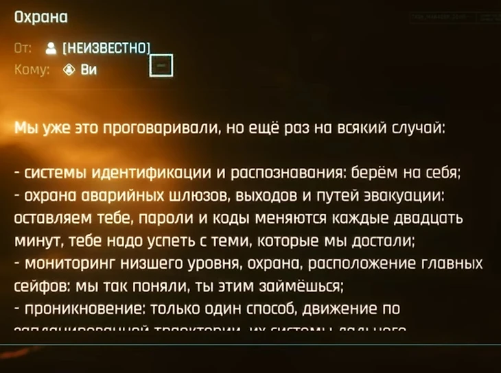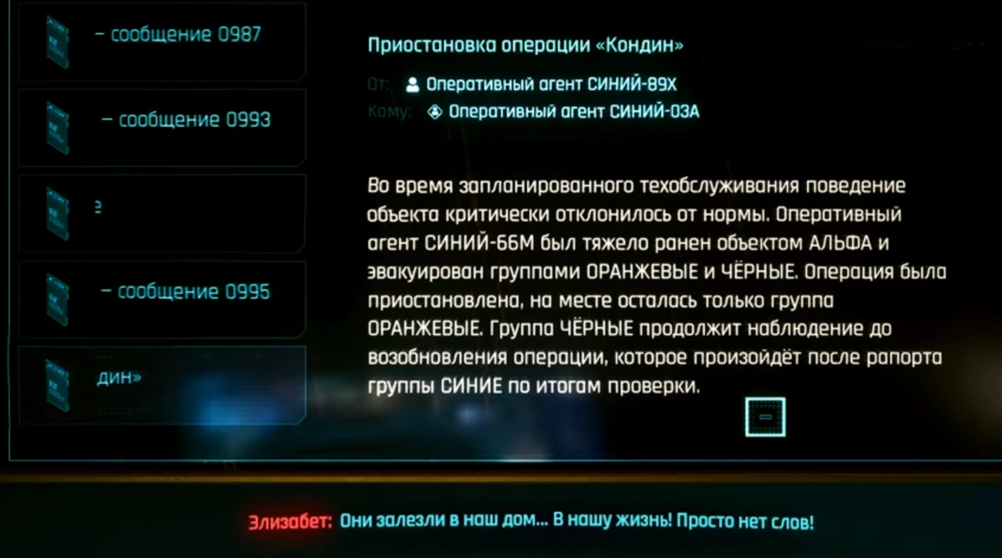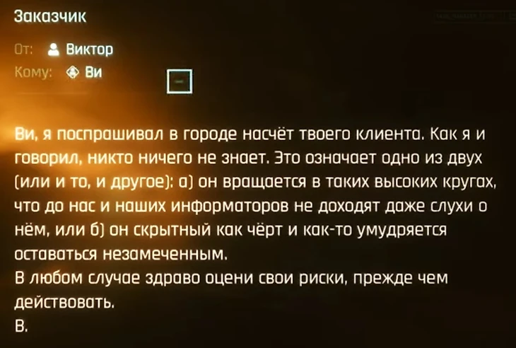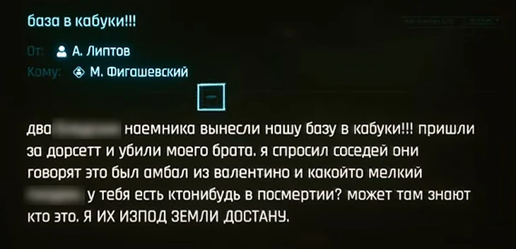 На компьютере в корабле, где Ви собирается на дело, можно прочитать два сообщения. Первое – от Вика. Никто из друзей и информаторов рипера не в курсе, откуда взялся Мистер Голубоглазый.