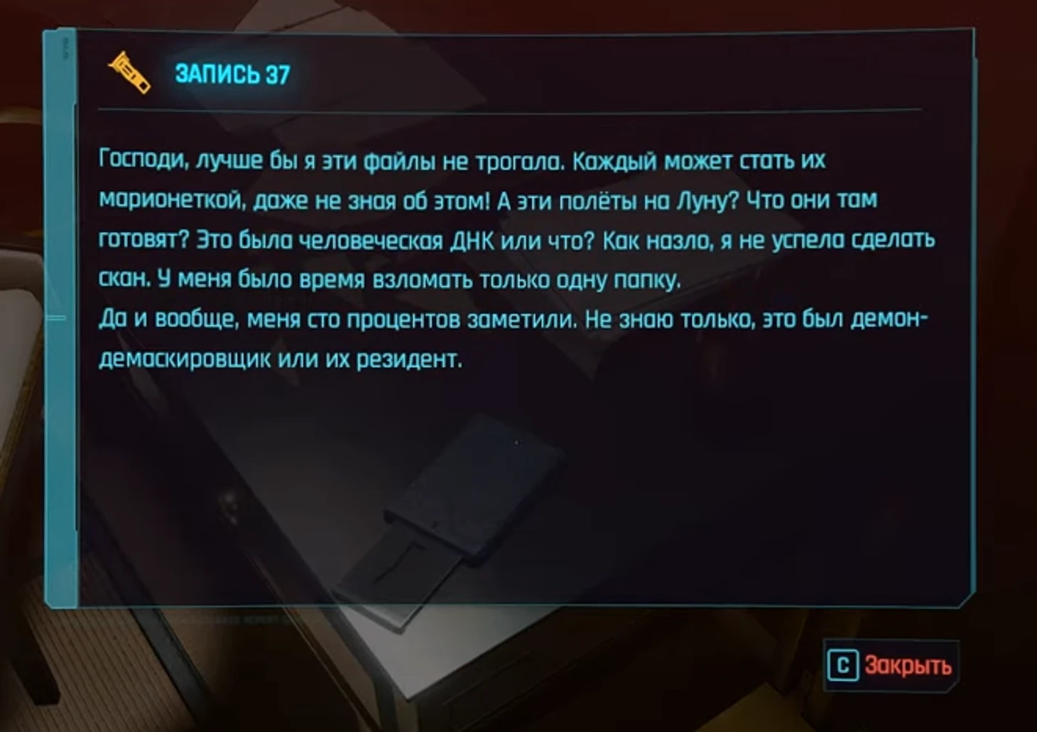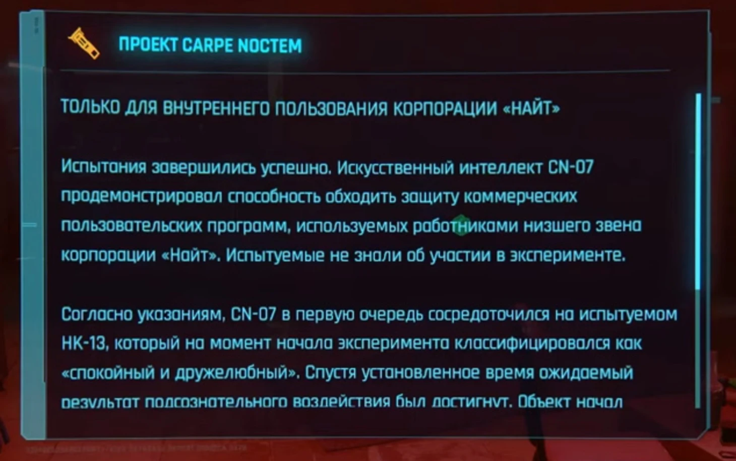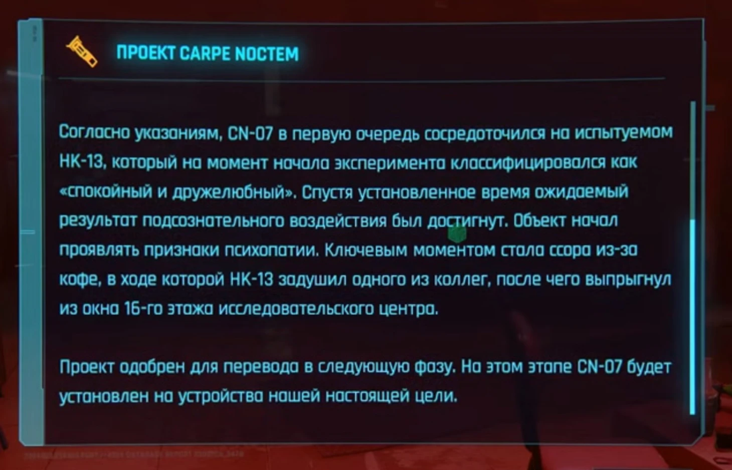 На модуле памяти Сандры находятся данные о проекте «Carpe Noctem» для внутреннего пользования копрорации «Найт». Если коротко, то это тесты ИИ Carpe Noctem-07 – он каким-то образом повлиял на подсознание испытуемого, и тот взбесился. Подопытный задушил коллегу и выпрыгнул из окна. Но в корпорации «Найт» считают, что это успех, и отчет заканчивается словами о том, что ИИ можно подселять на устройства настоящей цели. Имя этой цели не указано, но это, скорее всего, может быть Джефф Пералес.