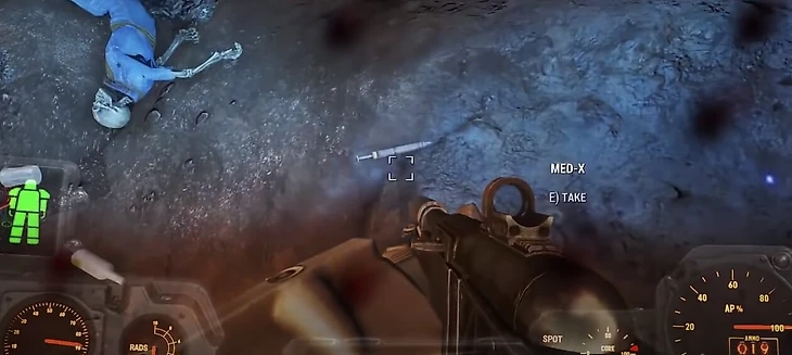 Бывшие наркоманы сошли с ума, когда увидели горы препаратов – они вернулись к прежним привычкам, начался хаос и насилие. Все погибли от передоза или перестрелок, судя по скелетам в комбинезонах. На удивление, когда главный герой нашел убежище, в нем еще были «психо», «винт» и другие препараты.