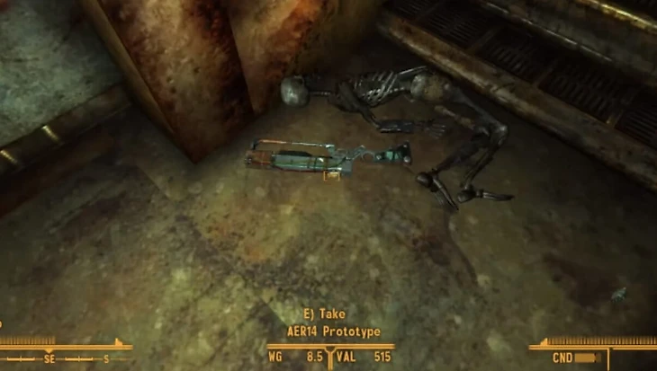 В убежище 22 спрятано уникальное энергетическое оружие – прототип винтовки AER14. Она лежит в «Общих помещениях», рядом со скелетом. New Vegas забагован, поэтому не удивляйтесь, что игра заглючит и не сгенерирует винтовку – помогает перезагрузка игры или перезаход в локацию. Не зная этого, вы легко упустите оружие.