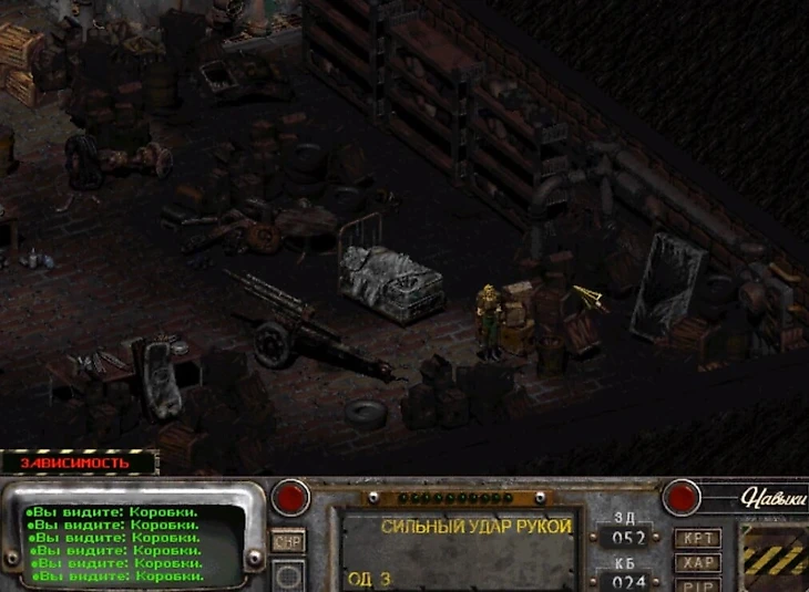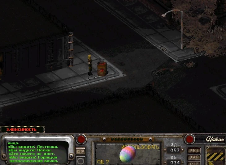 Разработчики Fallout 2 могут уверенно заявить, что в игре есть пасхалка, причем в прямом смысле слова. Шутки ради, пасхальное яйцо запихнули в подвал оружейного магазина в Нью-Рино – оно в тени вот этих ящиков. Заметить его можно, только наведя курсор на нужное место. А вот рабочую гаубицу довоенных времен вы точно не упустите – она оттягивает все внимание на себя.