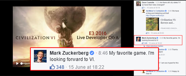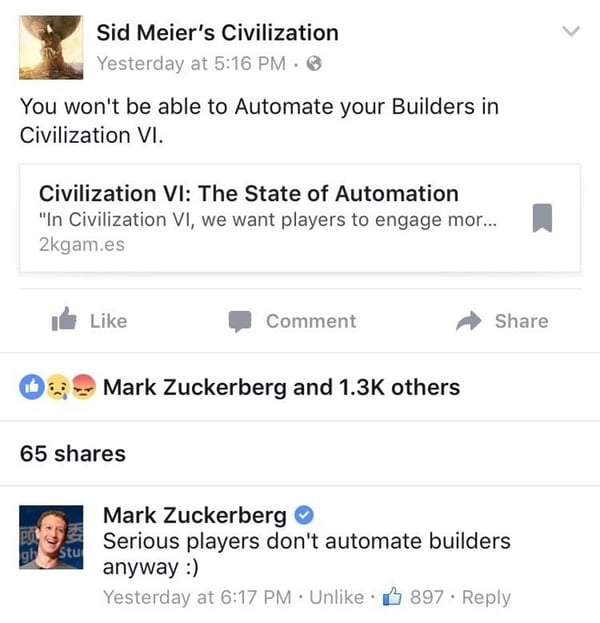 Цукерберг также периодически комментирует посты официального сообщества Civilization в фейсбуке. Например, когда стало известно, что строителей в Civilization VI нельзя будет использовать автоматически, он написал: «Серьезные игроки не пользуются автоматизацией строителей так и так :)».