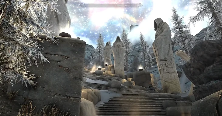 К слову о Совнгарде. Довакин любой расы ненадолго попадает в загробный мир, подобие Вальхаллы, по сюжетному квесту, чтобы победить Алдуина с помощью славных героев прошлого. По дороге от портала до Зала доблести стоят высокие статуи, напоминающие Седобородых.