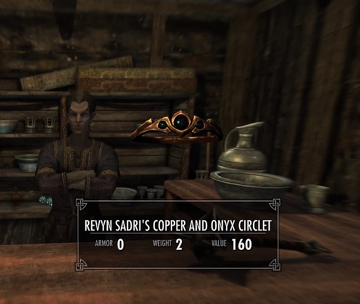 У продавца из «Подержанных товаров Садри» в меню покупок есть именной медный обруч с ониксом. Он ничем не отличается от обычных медных обручей – все так же весит 2 и стоит 50 золота. Только шанс появления обруча в инвентаре всего 0,5%, что делает обруч одним из самых редких уникальных предметов в Skyrim.