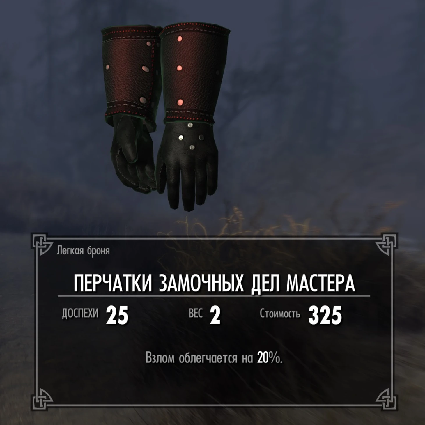 После прохождения сюжетной линии Темного братства Довакин может улучшить собственную комнату в данстарском убежище Братства. Там появятся особые перчатки, которые не встречаются нигде в игре – перчатки замочных дел мастера. Внешне они не отличаются от обычных перчаток теней, но у них 7 защиты против 8 у обычных – зато есть уникальные чары на облегчение взлома на 20%.