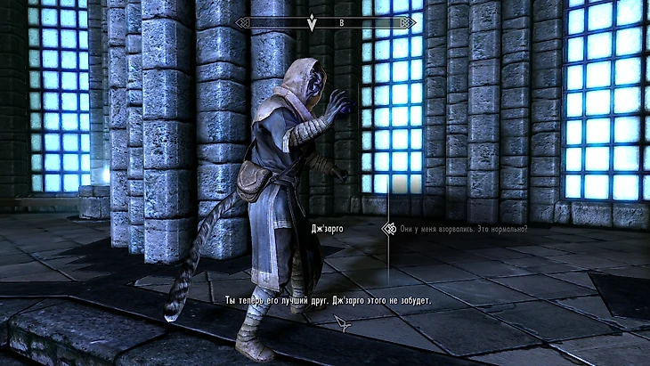 Дж’Зарго выдает 10 свитков для трех соперников – если вы потратите свитки впустую или выбросите из инвентаря, новых никто не даст, а хвостатый рассердится: «Ты что? Как это закончились? Дж’зарго тебе дал больше, чем достаточно. Фу, просто забудь, что Дж’зарго просил тебя помочь». После этого его невозможно взять в компаньоны, а жаль, потому что каджит – один из самых веселых и необычных напарников в игре.