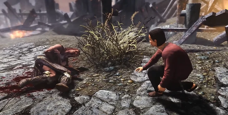 После нападения дракона начнется хаос. Обычный житель Хелгена Торольф умирает в первые минуты – вы слышали его диалог с сыном Хамингом, которому он запрещает смотреть на приехавших солдат. В игре присутствовала сцена, где Хаминг находится у тела умирающего отца. Довольно драматичный момент, который мало кто бы заметил, убрали. Зато в релизной версии Хаминга можно найти в хижине его деда Фроки, куда он переселится после нападения дракона.
