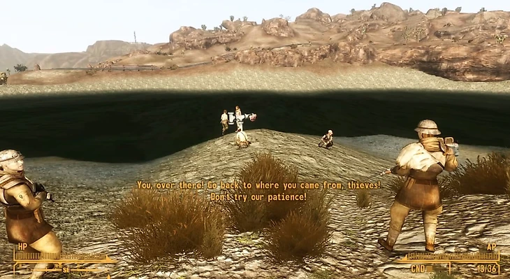 По сюжету предполагалось, что на водоочиститель рядом с озером Мид периодически приходили жители Мохаве и крали у НКР воду. Игрок становился свидетелем одной такой сцены – 4 обитателя пустыни крадут воду, но их замечают рейнджеры. Двое успевают сбежать, а остальные проклинают НКР за то, что забрали у граждан землю и воду. После этого военные убивают воров, хотя один даже не вооружен.