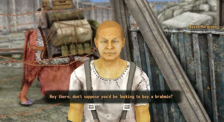 Из Вегаса вырезали 2 торговцев – Кевина Харгроува и Тома Дули. Харгроув предлагает облегчить ношу и купить брамина Бетси за 500 крышек.