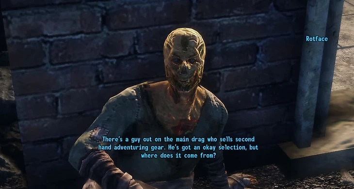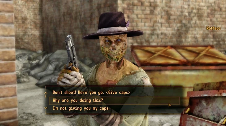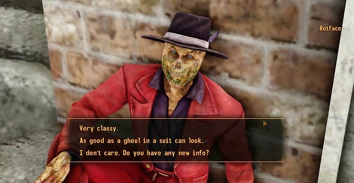Другой вариант – дарить крышки, воодушевляя Тлена ни в чем себе не отказывать. Гуль купит себе яркий костюм, но останется жить на улице. Ценник на советы вырастет до 100 крышек. Если после этого перезайти к нему в локацию, то на него нападут бандиты, заберут шляпу и деньги. На удивление, модный костюм гуля останется на трупе.