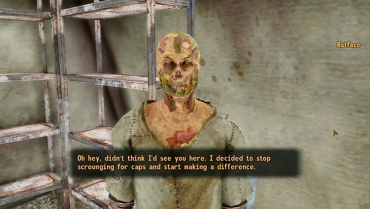 Гуль по прозвищу Тлен – добродушный нищий из Вегаса, помогающий советом за 1 крышку. Информация у Тлена разнообразная – от локации магазинов в городе, до пароля для входа на базу НКР. Сплетни и советы связаны в неотмечаемый квест «Болтовня Тлена», но для гуля планировали задание поинтереснее.