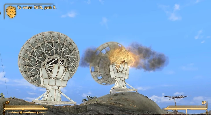 По задумке, если Табита видела Курьера до того, как тот устанавливает передатчик, то взрывала антенну вещания со словами «Никому не разрешается трогать оборудование, только мне!». Скрипт и диалог Табиты остались в файлах и были восстановлены, но на задание Братства они не влияют. Зато влияют на местность – взорванная тарелка падает рядом с горой Блэк и остается там до конца игры.