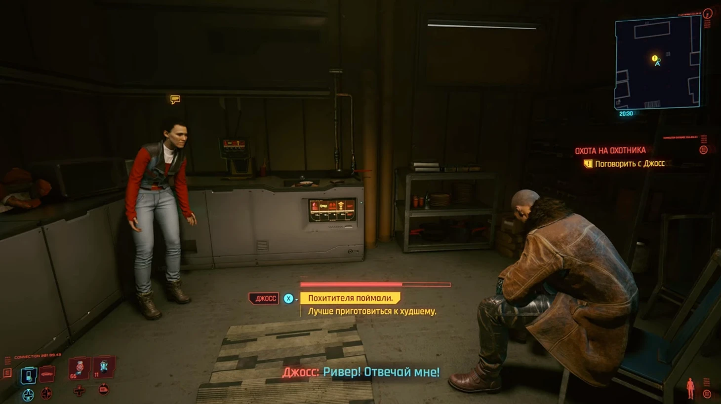 Ривер предложит отправить мультик Явэнь, чтобы вызвать сны у Харриса. Можно попробовать узнать IP-адрес Энтони, если вы прокачали Интеллект до 12 пунктов. После того, как вы все выясните, следуйте на ужин за Ривером. Он попросит сильно не пугать сестру в разговоре. После короткого разговора Ривер уйдет спать, а вы можете расспросить о жизни Рэнди – в том числе, об его отце, которого недавно убили «Альдекальдо». Хотя, по рассказам Джосс, он был плохим отцом.
