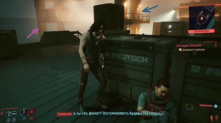 Когда он расскажет, где похоронили Сильверхэнда, от него не будет никакой пользы. Можно пристрелить его, забрать с тела ключ-карту, подняться на отмеченный синей стрелкой мостик и нажать на кнопку. В контейнере слева находится тачка Сильверхэнда – Porsche 911. Можно закончить мирным путем, оставив Грейсона в покое – он отдаст ключ-карту сам.
