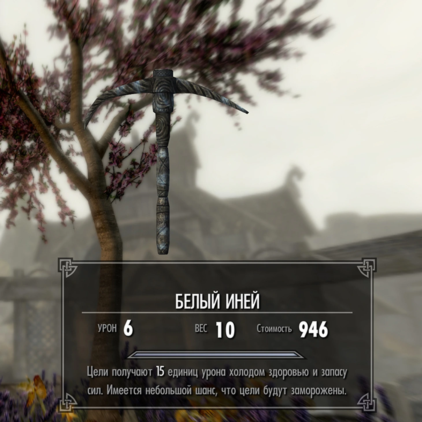 Выяснится, что в кургане захоронен драконий жрец Азидал. Он захватит разум Ралиса, и вы сможете убить эльфа, чтобы завладеть его уникальной киркой. Ее также можно просто выкрасть при прокачанном навыке «Дезориентация», который позволяет воровать экипированное оружие. «Белый иней» отличается от остального оружия особым зачарованием, которое, к сожалению, нельзя разобрать на пентаграмме душ.