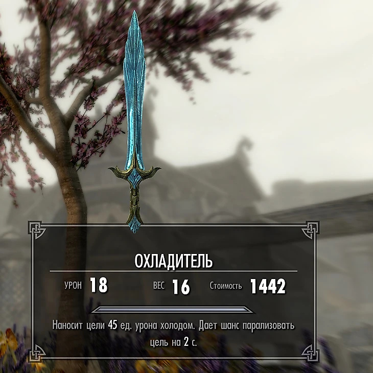 Меч «Охладитель» – оружие с уникальным внешним видом. Он напоминает стеклянный меч, но с голубым оттенком – возможно, он выкован из прочного льда наподобие сталгрима. В TES IV: Oblivion его можно получить в стороннем квесте, защитив двух сыновей фермера от нападающих на ферму гоблинов. Как он оказался у обычных крестьян – загадка.