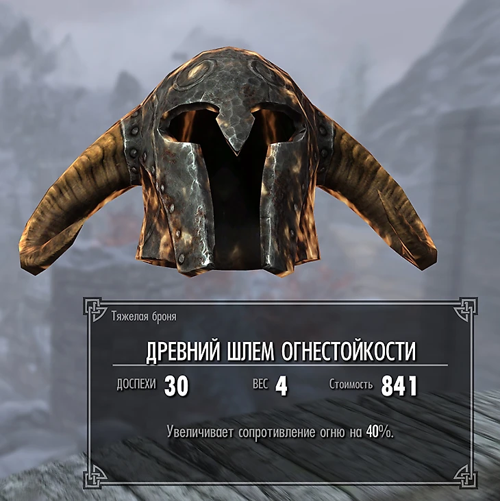 Когда квестовая цепочка Коллегии Винтерхолда отправит вас в Лабиринтиан за Посохом Магнуса, не спешите пробегать локацию. Посреди древних руин лежит шлем с отличной огненной защитой. Зачарование снимать бесполезно, если вы не прокачивали соответствующую ветку – зачарованные предметы будут защищать слабее. А вот если вы играете за танка и собираетесь в логово огненных атронахов и пиромантов, то шлем будет незаменимым помощником.
