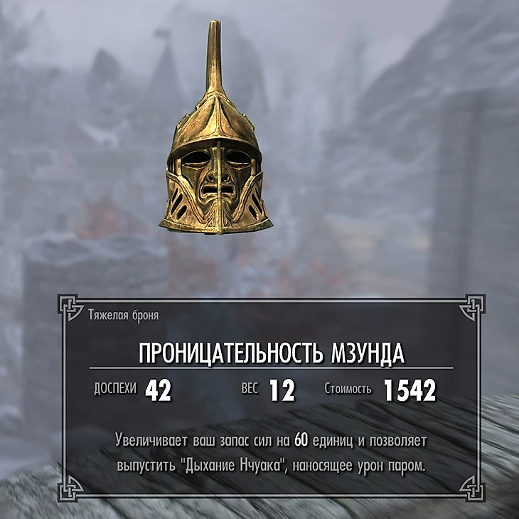 Этот шлем можно найти, если вы любите гулять по Солстейму и залезать в руины без квестов. Он находится в Фалбтарзе, причем в самой глубине развалин. По дороге вглубь придется решить головоломку, избежать ловушек и наткнуться на тела других искателей приключений. Зато наградой будет уникальный шлем, который наносит урон паром. «Дыхание Нчуака» расходует часть запаса сил и наносит 15 урона в секунду.