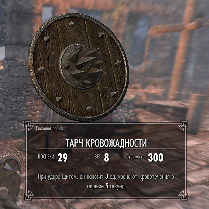 Во-первых, посмотрите, какие у него здоровенные шипы! Во-вторых, у этого щита зачарование на кровотечение – пригодится против толпы противников, когда вы раните одного щитом и переключитесь на другого. Урон от шипов суммируется, так что два и три удара щитом будут наносить 6 и 9 урона в секунду – а это минус 30 и 45 здоровья у соперника. Довакину останется лишь добить выживших и уйти красиво.