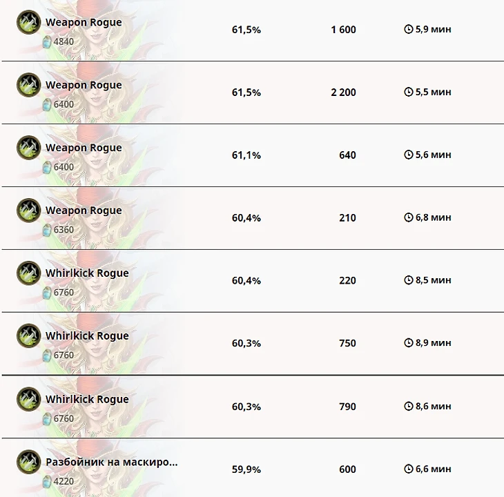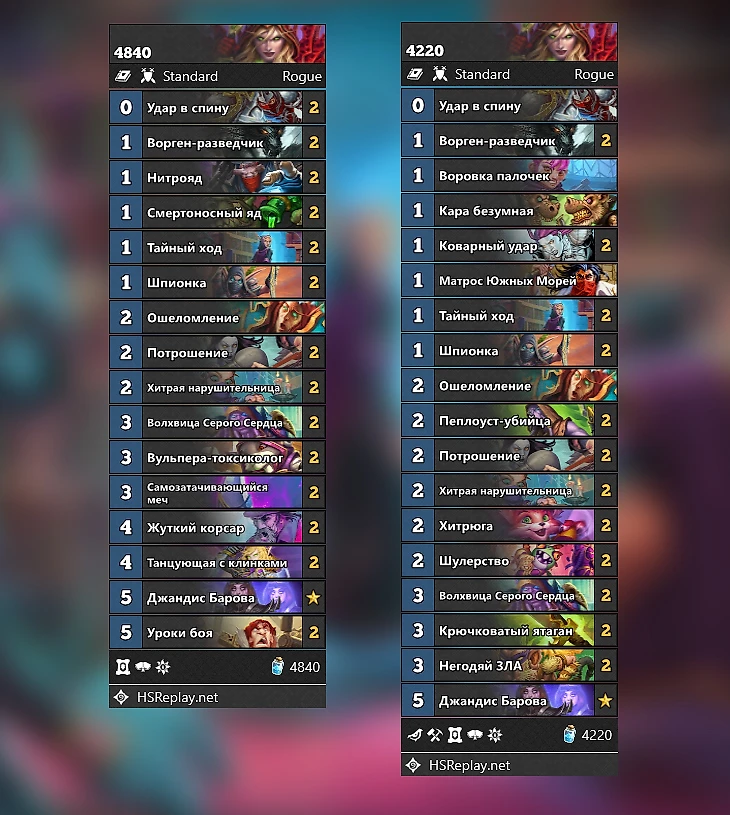Разбойница на оружии без «Доктора Крастинова» стоит 4840 пыли. А разбойник на маскировке контрит рамп-паладина – только у этой колоды, токен-друида и контрольных воинов положительный винрейт против него.