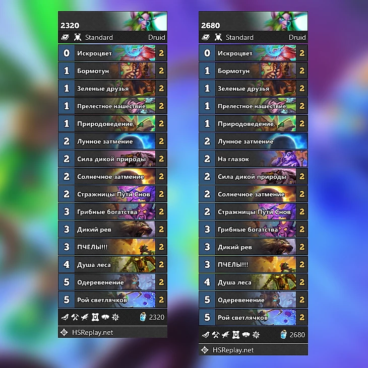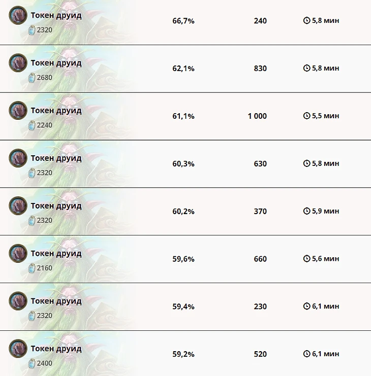Удивительно, но в топе HSreplay 8 колод за 2 тысячи пыли. Токен-версия получила в мини-дополнении мощнейший бафф «Одеревенение», что спасает маленькие токены от зачистки. А в сочетании с «Солнечным затмением», которое заставляет следующее заклинание сработать дважды, получается убийственное (буквально) комбо.