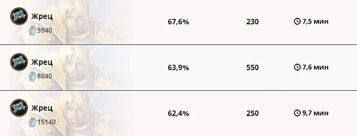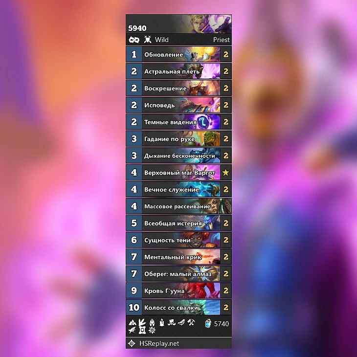 Худший класс стандартного режима прекрасно чувствует себя в вольном. Лучшая по проценту побед колода стоит больше 5 тысяч, но это все еще дешевле 15-тысячного хайлендера. Жрец всегда был дорогим классом, поэтому необычно видеть в топе колоду за 5940 пыли (1600 из которой – «Архимаг Варгот», которого раздавали бесплатно).