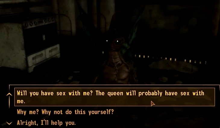 В защиту спорного контента в Frontier фанаты вспоминают Fallout 2, где работорговля – один из способов заработка, да и в New Vegas были такие персонажи как гуль-проститутка и секс-робот по имени «Фисто».