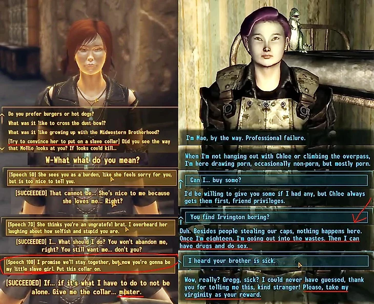 Остальной контент в моде тоже вызвал вопросы. Критике подверглось то, за что фанаты любят серию Fallout – персонажи и диалоги. Игрокам особенно запомнились две девушки – 18-летняя Америка, которая становится личной рабыней главного героя, и Мэй, мечтающая о совершеннолетии – ведь тогда она сможет заняться «взрослыми делами». Кажется, теперь извращенцем стали считать не только одного аниматора.