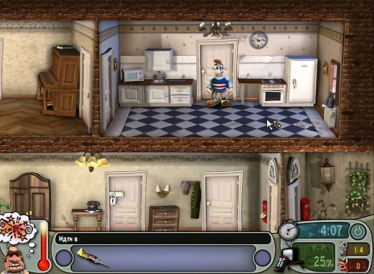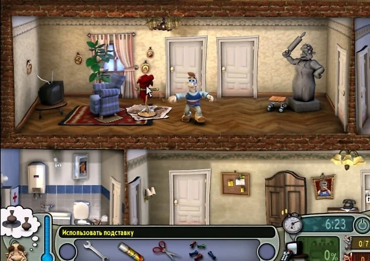 Увы, тактического геймплея ожидать не стоит. «Из России с любовью» – очередная скудная копия оригинала без новых механик или хотя бы идей для ловушек. Все уже много раз использовалось как в Neighbours from Hell, так и в клонах – из уровня в уровень нужно что-то приклеить, отвинтить или разлить.
