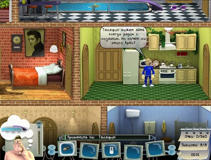 Цель игры – довести соседа до истерики различными пакостями, используя подручные предметы. Попадаться на глаза во время установки ловушки нельзя – сосед изобьет Вуди и уровень придется начинать сначала. Различных козней куча: от раскидывания канцелярских кнопок на полу и закидывания унитаза туалетной бумагой до спрятанного в микроволновке яйца и обмазывания зубной щетки гуталином.