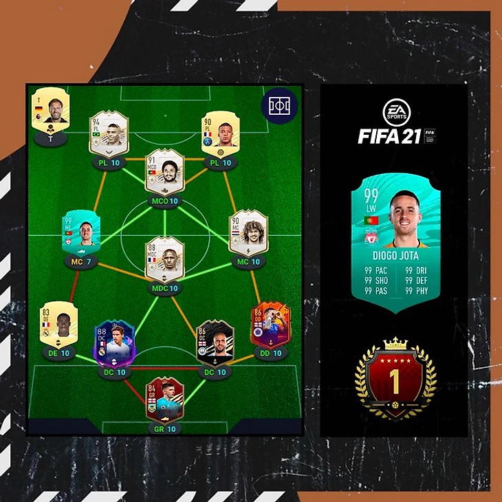 Состав у Жоты смертоносный. Сам португалец получил от ЕА специальную карточку с рейтингом 99 (и да – все скиллы у него тоже 99). Такую привилегию может себе позволить только реальный футболист, который по сути продвигает продукт. Схожие карточки получили Трент Александер-Арнольд, Мэйсон Маунт, Серхио Агуэро, Килиан Мбаппе, Сержиньо Дест. Их составы можно посмотреть тут.