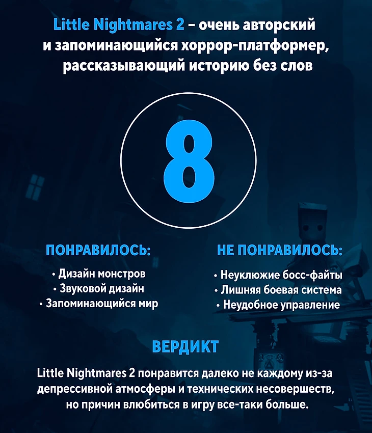 Все это, безусловно, портит впечатление, но в масштабе всей игры оказывается не таким уж значительным. Little Nightmares вот-вот станет культовым хоррором, который утешит даже некоторых фанатов Silent Hill – хотя из-за мультяшной стилизации игра пугает куда меньше, чем могла бы. Tarsier Studios придумала интересную и совершенно отвратительную вселенную, о героях которой хочется строить теории и рассматривать каждый уголок локаций. И если в следующей части этим можно будет наслаждаться, не ворча на грубоватый гейм- и левел-дизайн, будет совсем замечательно.