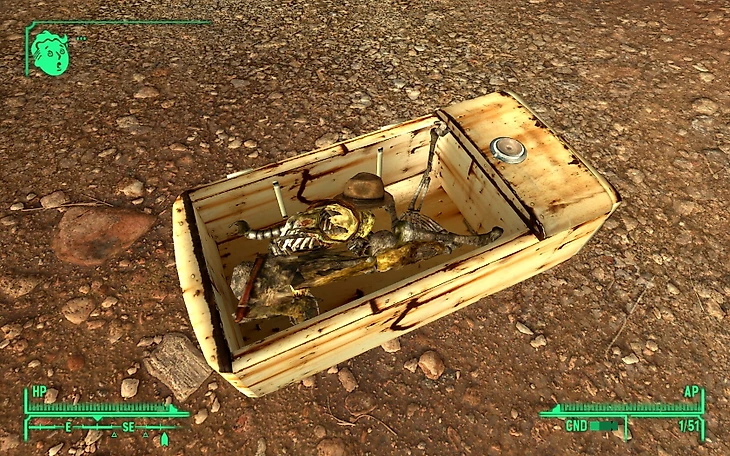 Холодильник с останками Джонса от мира New Vegas находится на юго-востоке от поселка Гудспрингс – между парашютной школой Джин и пещерой Гудспрингс. Но, как и в случае с остатками дяди и тети Скайуокера, необходим перк «Дикая пустошь» – без него на этом месте ничего не будет. Зато в отличие от пасхалки на «Звездные Войны», в холодильнике лежит уникальная шляпа, которая прибавляет 1 очко восприятия.