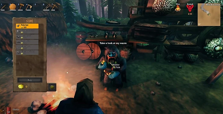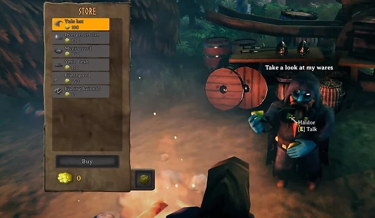 Хальдор продает свои товары за монеты, которые выпадают из врагов в подземельях и встречаются в сундуках. Помимо этого, торговец с радостью купит у вас янтарь и рубины. Чтобы больше не искать торговца, создайте портал рядом с Хальдором. Так вы сможете попасть к нему из другого портала, но не забудьте связать портал торговца с другим порталом (например, на вашей базе).