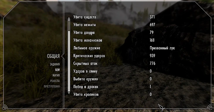 К концу прохождения приятно взглянуть на статистику прохождения в главном меню. В списке покажут сотни или тысячи бандитов, драугров, механзимов, десяток драконов – в общем, все, чтобы действительно считать себя героем и спасителем этого мира. А в самом низу раздела «Бой» можно увидеть, сколько невинных милых кроликов вы убили – нарочно или случайно. Как видите, моя совесть абсолютна чиста!