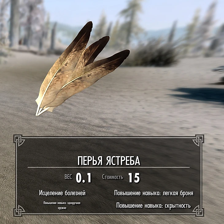 Птицы в Skyrim не совсем бесполезны, хотя по большей части служат декорацией – в файлах игры они записаны как объекты, а не как актеры. Меткие Драконорожденные могут убить ястреба магией или луком ради получения перьев – ценного алхимического ингридиента. На ранней стадии игры, когда навык алхимии не вкачан, а тратить золото на зелье исцеления болезней не хочется, перья ястреба помогут вылечить болезнь. Дело в том, что среди остальных ингредиентов с таким эффектом (также лечить болезни могут перья фельсадской крачки, жареная злокрысья нога, клешня грязевого краба и прах вампира) у перьев ястреба эффект исцеления находится на первом месте – а значит, вам не придется бежать к алхимическому столу и смешивать компоненты, прокачивая алхимию.