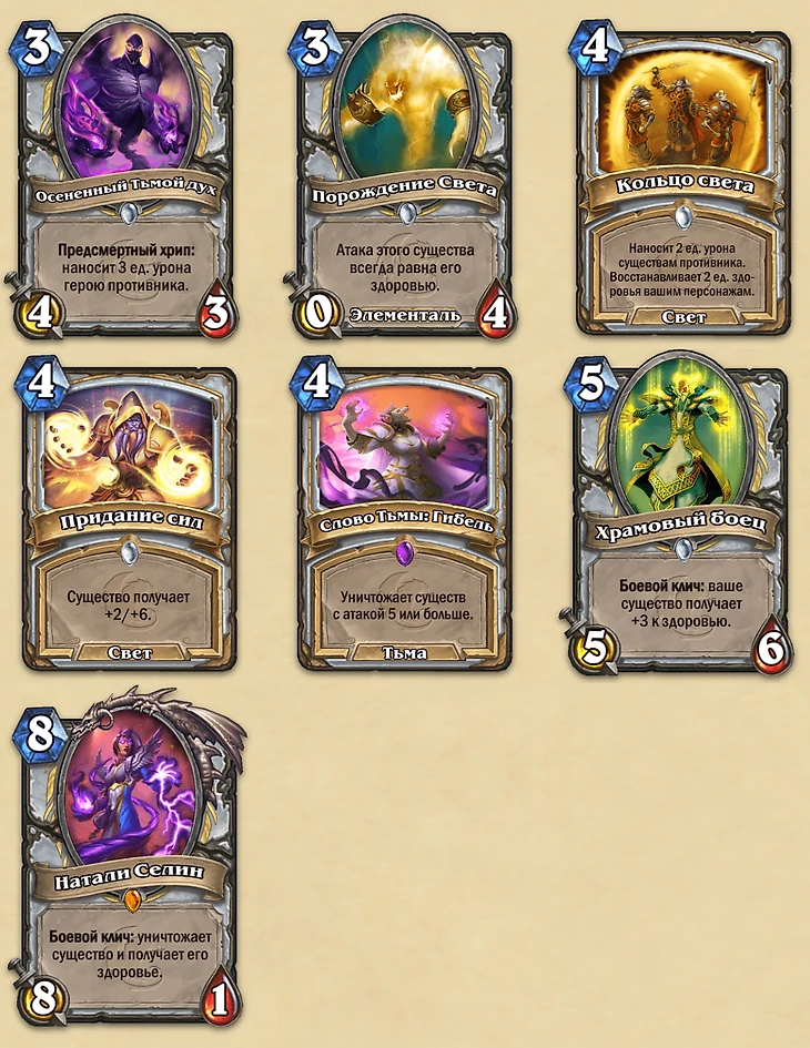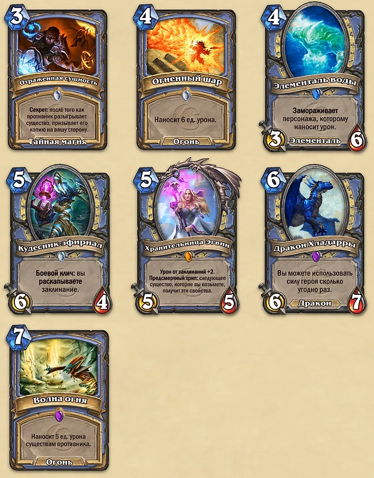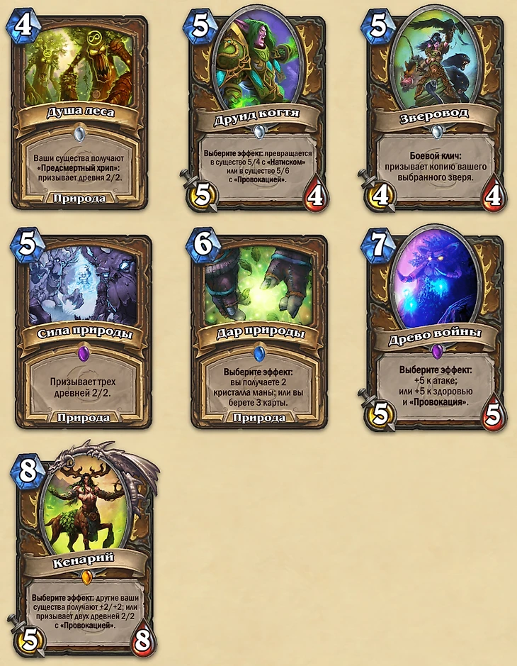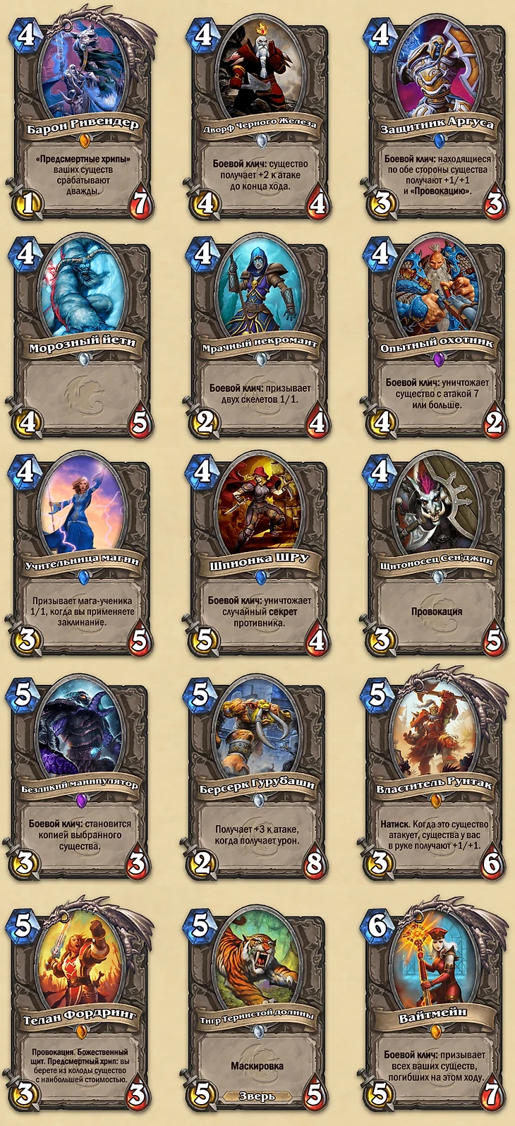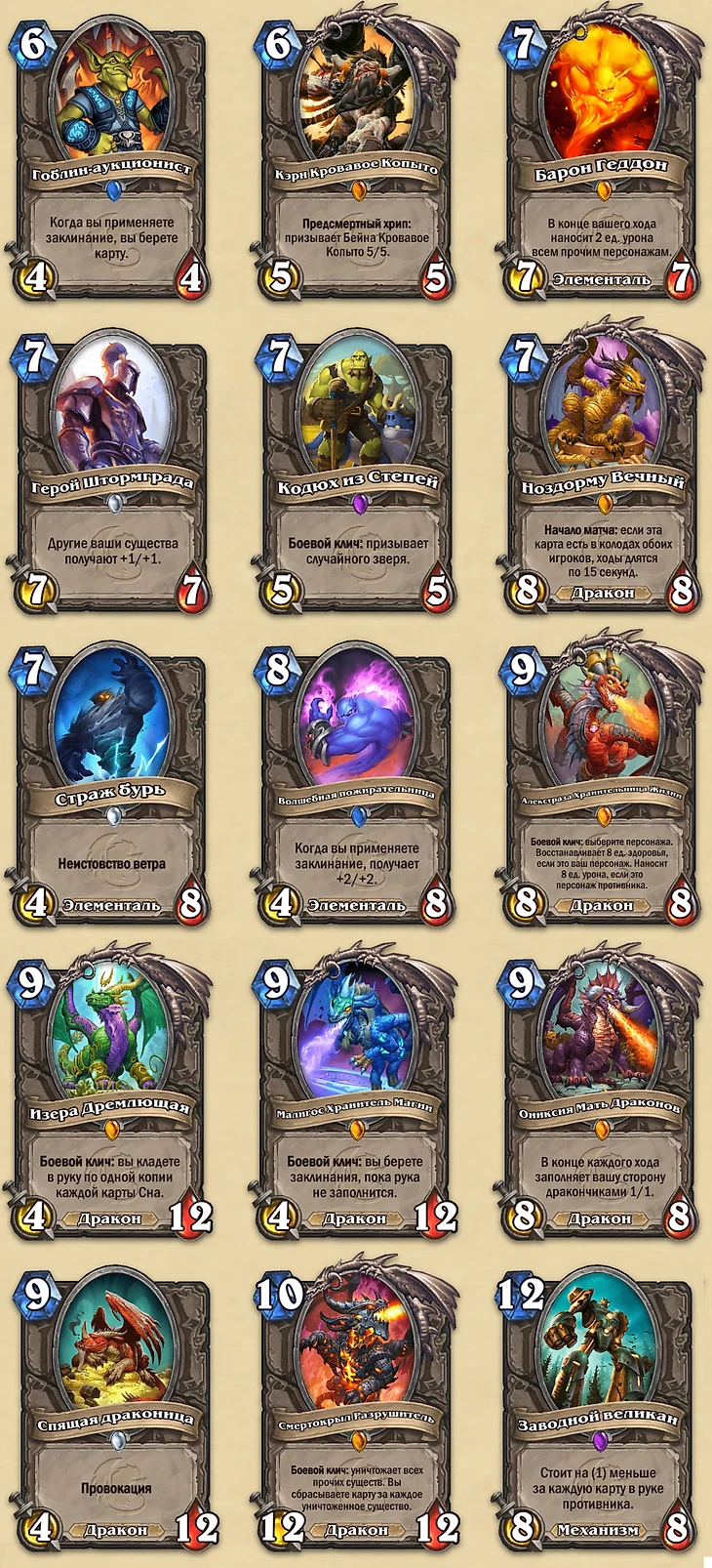 Тут много знакомых лиц – кому-то добавили 1 атаку, кому-то здоровье, кого-то удешевили. Сильно изменились только драконы – например, Ноздорму теперь срабатывает только если у вас обоих есть эта карта в колоде, а Малигос больше не дает +5 к силе заклинаний.