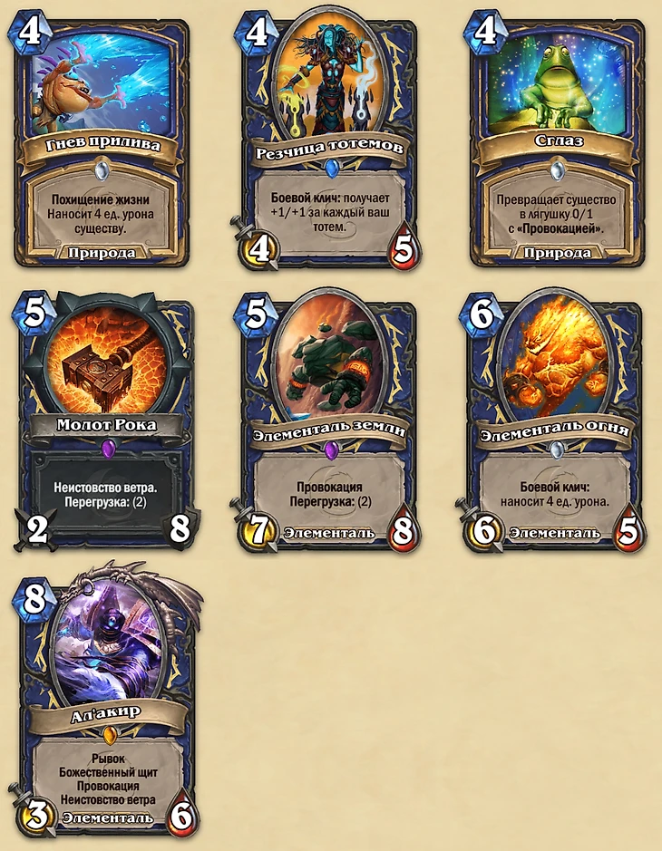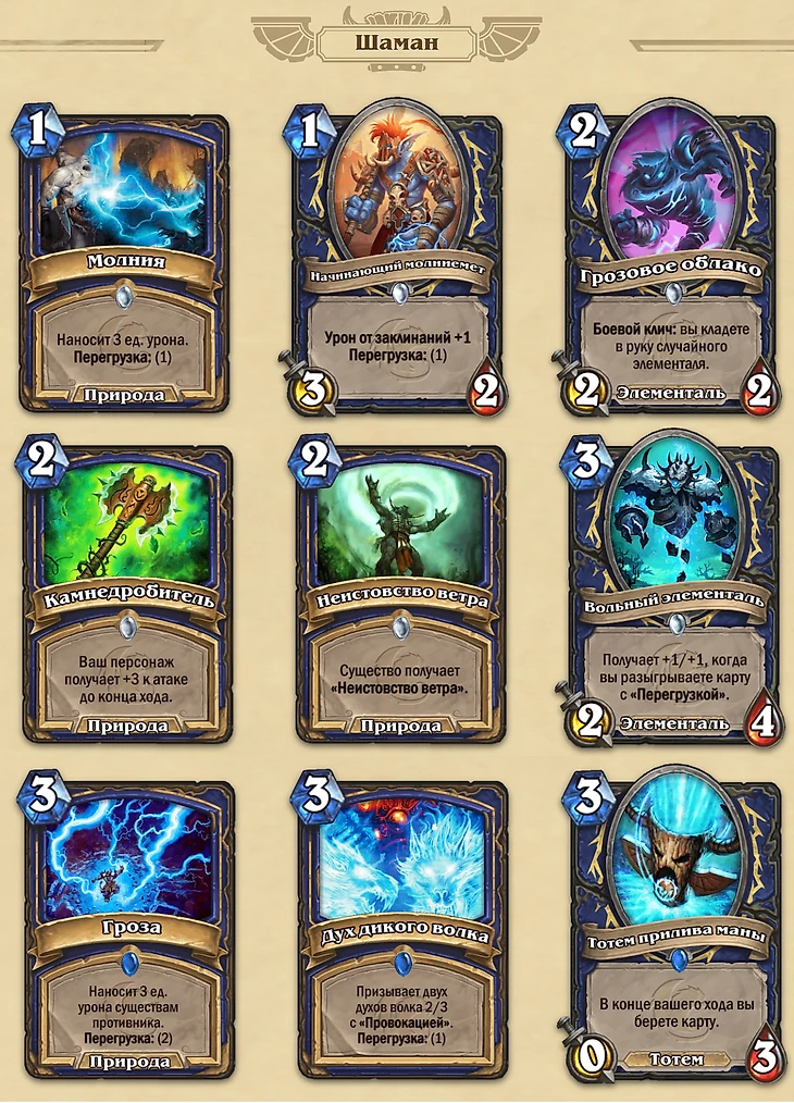Обычная «Гроза» стала грозным оружием – если раньше рандом выдавал 2 урона против агрессивных соперников, и вы проигрывали игру, то теперь она точно зачистит вражеских существ с 3 здоровья. А чтобы было не так мучительно больно в ранней игре, можно положить в колоду «Начинающего молниемета» – у него отличные статы 3/2, как у «Огненного беса», а перегрузка одной маны во многих ситуациях не критична. Это неплохая замена тотему «Гнева воздуха», которого у Тралла больше не будет.