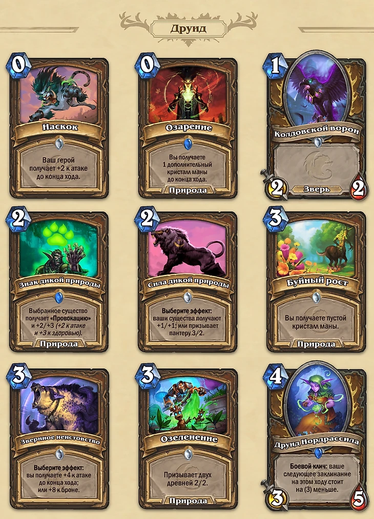 «Лунный огонь», «Гнев», «Размах» – забудьте. Теперь Друиду попросту нечем зачищать стол – только «Наскоком» и «Звериным неистовством», то есть, лицом. Поэтому, вероятно, все будут играть более агрессивными колодами – благодаря возвращению «Ворона». Но как токен-друид будет жить без «Дикого рева» – интересный вопрос.