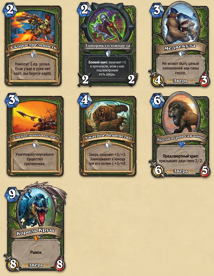 Рексару совсем плохо – ни «Питомца», ни «Команды «Взять!», ни «Лука Орлиного рога», ни «Спустить собак» в стандарте не будет. Вместе с ними пропадают «Фазовый хищник» и пачка секретов. Из оставшегося сложно слепить что-то в единую колоду – хотя Blizzard еще не показала все карты «Закаленных степями», где, вероятно, Чемпиону Орды Рексару уделят внимание.