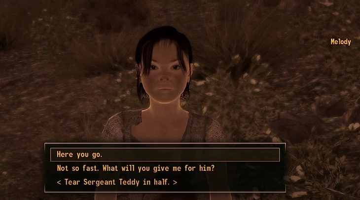 И если вы думаете, что все это делается лишь для радости маленькой девочки, то вы не правы. В диалоге с Мелоди будет несколько опций, одна из которых – разорвать мишку у нее на глазах. Но только стоит ли изначально искать медведя только для того, чтобы порвать его перед лицом девочки?