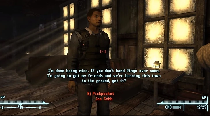 Вот только за все это игрок может оплатить мерзким поступком прямо в начале игры. После того, как вы поговорите с Санни Смайлс и попрактикуетесь с ней в стрельбе, вы вернетесь в салун, где станете свидетелем конфликта владелицы заведения и некого Джо Кобба. Парень требует выдать ему караванщика Ринго, который сбежал от банды Кобба во время нападения. Но жители Гудспрингса отличаются добродушием и готовы ценой своей жизни защищать Ринго.