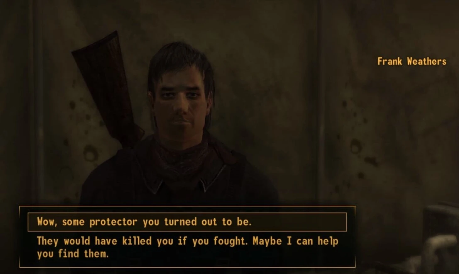 Но никто не запрещает вам помочь Джо и его бандитам убить караванщика и более того – захватить весь город. Для этого нужно поговорить с Коббом после конфликта в баре и намекнуть, что после захвата города он станет мэром Гудспрингса. Естественно, такая идея радует бандита, и он бежит за своими друзьями, чтобы вместе с Курьером атаковать городок и уничтожить несогласных.