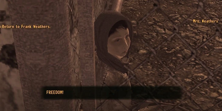 Помимо возможности спасти семейство, Курьер может жестоко убить их двумя способами. Первый – сбросить на лагерь Коттонвуд-Коув (в котором и находятся рабы) радиоактивные бочки. С одной стороны, таким образом НКР мстят Цезарю за городок Серчлайт, который легионеры уничтожили радиацией, но с другой – умирают и несчастные рабы.