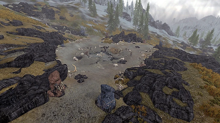 Останки мамонтов находятся во всех лагерях и стоянках великанов, а в окрестностях Вайтрана можно найти целое кладбище. Иногда там появляется относительно свежий труп мамонта и два разбойника, с которыми легко расправиться и забрать добычу (то есть, хобот мамонта) себе.