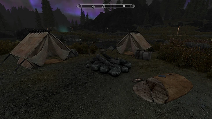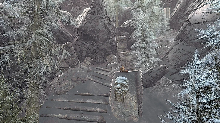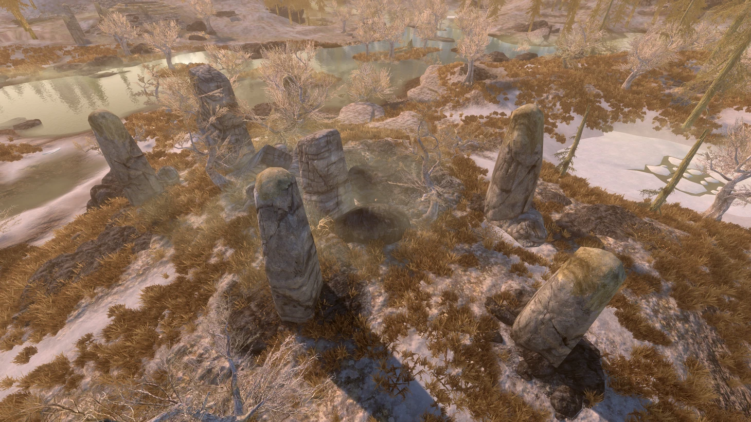 Неподалеку от локации из предыдущего пункта находятся странные камни. Вероятно, когда-то здесь была нордская гробница – об этом можно догадаться по паслену и по погребальным урнам. А издалека это место выглядит как Стоунхендж.